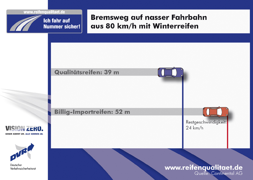 Der Sicherheit zuliebe gilt: Auf keinen Fall am Reifen sparen! Auch nicht durch den Kauf von besonders preiswerten Winterreifen. Erst im September hat die Gesellschaft für Technische Überwachung mbH (GTÜ) Billigreifen getestet. Alle Testkandidaten wiesen deutlich längere Bremswege als der Referenzreifen auf, zusätzlich schwammen die Reifen schon bei 80 km/h auf Wasser auf. Eine gefährliche Aquaplaningsituation, in der der Referenzreifen problemlos die Spur hielt. Der Kommentar von GTÜ-Chef Rainer de Biasi: „Das sind verheerende Ergebnisse.“ Noch dazu entsprechen viele dieser Reifen nicht den europäischen Standards: So war auf einigen Exemplaren sogar das M+S-Symbol („Matsch und Schnee“) abgebildet, obwohl es sich um reine Sommerreifen handelte.