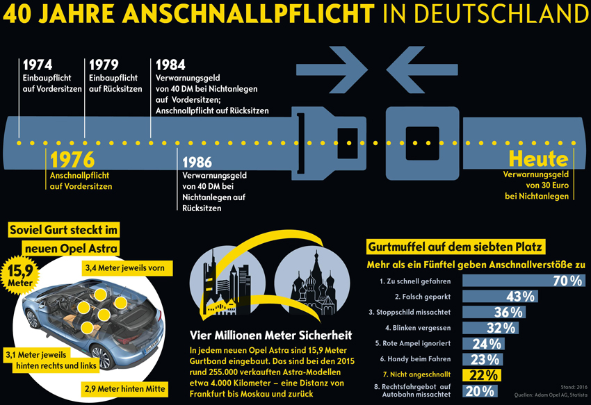 Die bloße Pflicht änderte aber in der Praxis nicht viel. Da Gurtmuffel über acht Jahre mit einer Belehrung davonkamen, sahen viele Autofahrer das Gesetz nur als eine freundliche Empfehlung. Erst das im August 1984 eingeführte Bußgeld in Höhe von 40 Mark veränderte die Anschnallmoral dann schlagartig – die Anlegequote stieg in kürzester Zeit von 60 auf 90 Prozent. Bis heute hat sich die Quote sogar auf einem noch höheren Niveau eingependelt: Auf Vordersitzen schnallen sich über 97 Prozent an, auf den Rücksitzen immerhin 94 Prozent (Quelle: DEKRA Unfallforschung). Dazu beigetragen hat auch der inzwischen serienmäßige Gurtwarner, der die Insassen mit optischen und akustischen Signalen unbarmherzig zum Anschnallen auffordert.