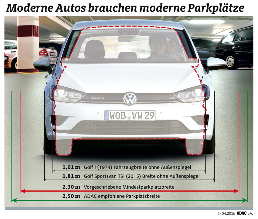 Als größtes Problem erwies sich einmal mehr die Breite der Parkplätze. In den meisten Testobjekten wurden zwar die in den Garagenverordnungen der Bundesländer vorgeschriebenen Mindestbreiten von 2,30 Metern eingehalten – nicht aber die Breiten gemäß den Empfehlungen für Anlagen des Ruhenden Verkehrs der Forschungsgesellschaft für Straßen- und Verkehrswesen von mindestens 2,50 Meter. Angesichts der immer breiter werdenden Fahrzeuge reicht diese Vorgabe der Garagenverordnungen aus den 1970er-Jahren nicht mehr aus.