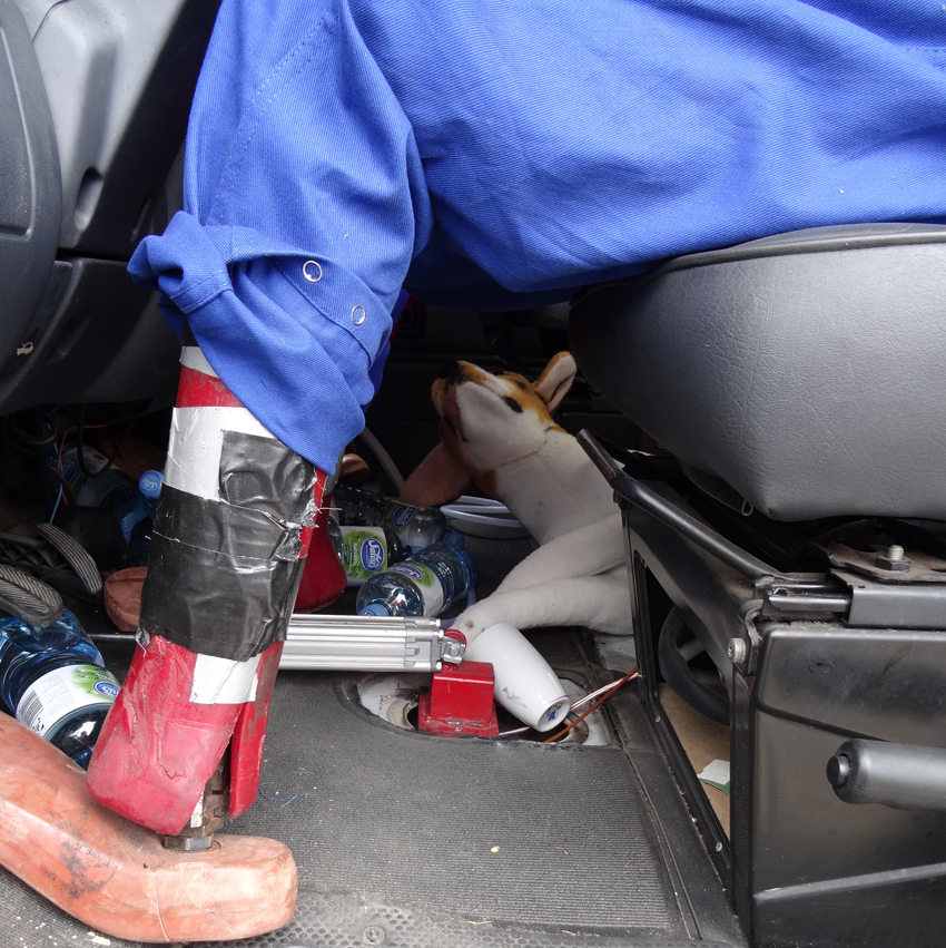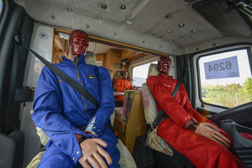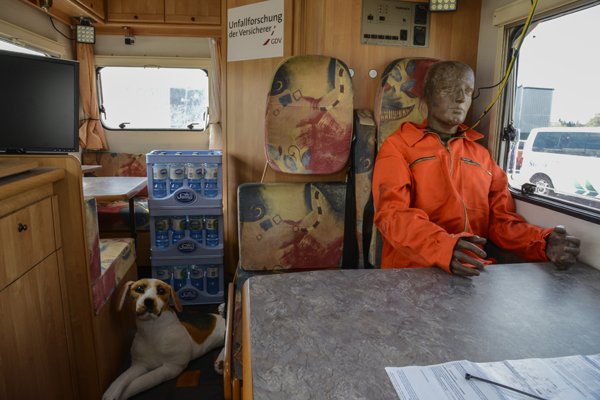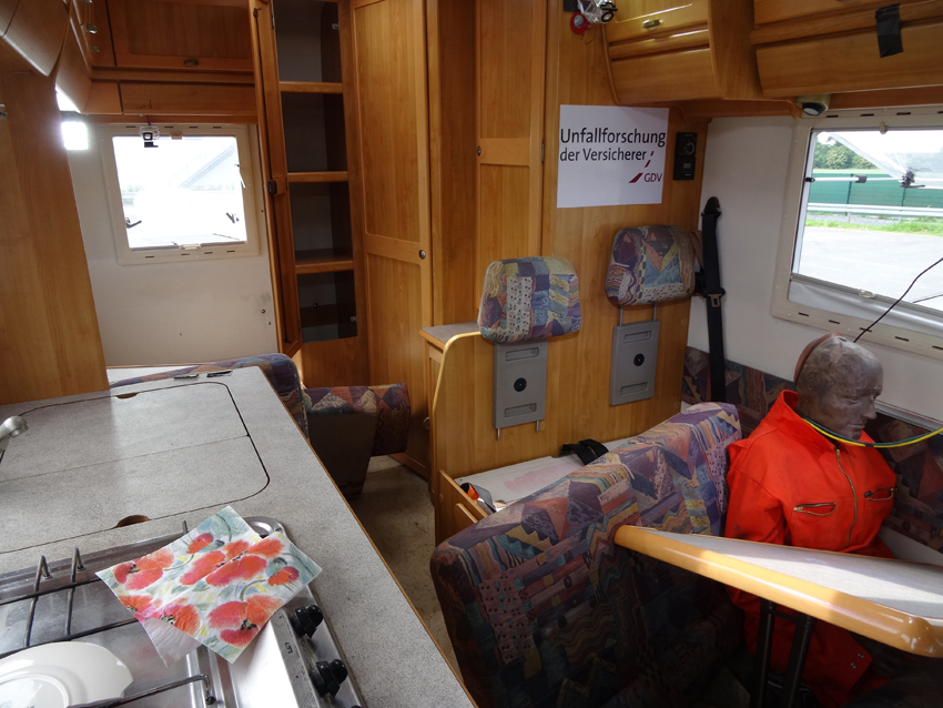 Die Wucht des Aufpralls und ungesicherte Ladung Wohnmobile im Straßenverkehr – Crashtest der Unfallforschung der Versicherer (UDV) bei CTS in Münster. Foto: Petra Grünendahl,Im Wohnmobil flogen ungesicherte Gegenstände mit rund 30 km/h durch das Fahrzeug Richtung Cockpit. Eine Wasserflasche (wenigstens war sie nur aus Plastik) schaffte es bis zur Frontscheibe. Pfiffi knallte mit voller Wucht gegen das Armaturenbrett. So leblos wie der Dummy dürfte nach so einem Sturzflug auch ein echter Hund vorne im Fußraum zwischen den Frontpassagieren liegen. Der Fahrer ist noch am wenigsten verletzt. Auch der Beifahrer saß vorne doch recht geschützt. Gegenstände von hingen haben zumindest die beiden nicht getroffen. Hinten hingegen herrscht ein Chaos. Nicht nur sind Hausrat und Ladung wild verstreut. Auch der Fondpassagier liegt mehr unter dem Tisch, der auch aus seiner Verankerung gerissen wurde. Im Wohnmobil ist er am schwersten verletzt, aber immer noch besser dran als der Insasse im Pkw.