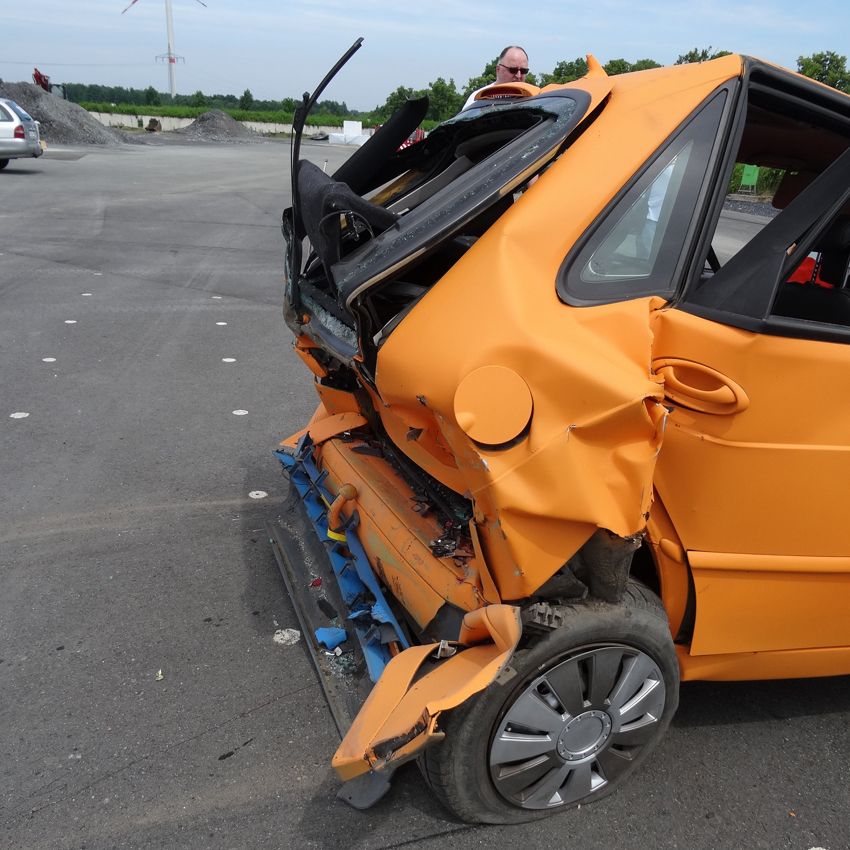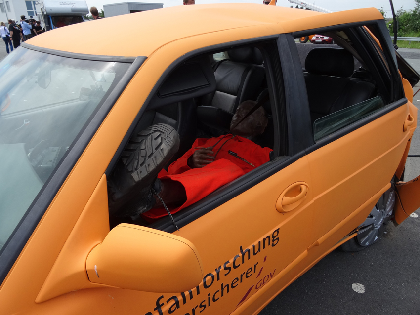 Wohl eher nicht ganz enstpannt: der Pkw-Fahrer nach dem Crash. Wohnmobile im Straßenverkehr – Crashtest der Unfallforschung der Versicherer (UDV) bei CTS in Münster. Foto: Petra Grünendahl,Der Pkw wurde durch den Aufprall mehrere Meter nach vorne geschleudert. Der Fahrersitz des angefahrenen Fahrzeugs ist wohl gebrochen, der Fahrer „liegt“ schwerverletzt in seinem Auto. „Der ist ja ganz entspannt“, witzelt ein Kollege, aber der Fahrer wird am Lenkrad wohl kaum den linken Fuß zum Fenster raushängen gehabt haben. Der „Liegesitz“ nach dem Unfall wäre auch nicht geeignet, das Lenkrad noch in Händen zu halten. Möglicherweise hätte der Insasse des Pkw den Unfall gar nicht überlebt.