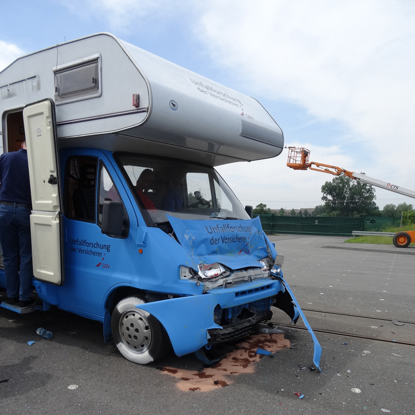 Wohnmobile im Straßenverkehr – Crashtest der Unfallforschung der Versicherer (UDV) bei CTS in Münster. Foto: Petra Grünendahl,Die steigenden Neuzulassungen und damit der wachsende Bestand erhöht das Risiko. Detailwissen über die Struktur von Unfällen mit Wohnmobilen hilft, Unfallrisiken abzubauen. Von den 2014 bei Wohnmobilunfällen Getöteten waren vier Insassen im Reisemobil selbst, aber elf bei den anderen Unfallbeteiligten zu verzeichnen. Die Relationen bei Schwerverletzten sind ähnlich. Auch wenn die Zahl der Getöteten 2015 auf 19 stieg, sind die Zahlen eher seit Jahren rückläufig. Das Durchschnittsalter der verunglückten Wohnmobilen liegt bei 13,2 Jahren.
