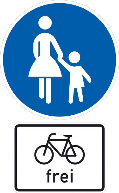 Das Radfahren auf Gehwegen kann jedoch mit dem Zusatzzeichen „Radfahrer frei“ zugelassen sein. Radfahrer müssen dann jedoch Rücksicht auf Fußgänger nehmen. Durch das Schild sind sie nicht verpflichtet den Gehweg zu nutzen, sie dürfen also auch auf der Fahrbahn fahren.