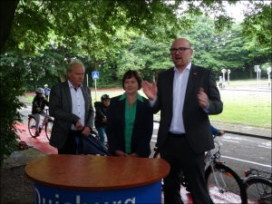 Als die Kett-Cars noch Autos ersetzten Freuten sich über die zeitgemäß gestaltete Anlage der Jugendverkehrschule Rheinhausen (v. l.): Herbert Schulz (Bürgerstiftung), Polizeipräsidentin Dr. Elke Bartels und Oberbürgermeister Sören Link. Foto: Petra Grünendahl.In der Anfangszeit waren bei Übungsstunden neben Fußgängern und Radfahrern auch Kett-Cars auf dem Platz unterwegs, die für den Autoverkehr standen: Sie waren ebenso wie die Fahrräder (und Schulungsmaterial) von der Shell-Jugendstiftung gesponsert worden und entsprechend in Gelb und Rot lackiert und mit Logo verziert. Den Rollentausch gibt es heute nur noch zwischen Fahrradfahrern und Fußgängern. Kett-Cars fahren auf der Anlage nicht mehr.