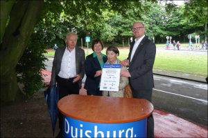 Netzwerk „Duisburg. Aber sicher!“ bedankt sich bei den Unterstützern Sponsoren ermöglichten die Sanierung der Jugendverkehrsschule an der Bergheimer Straße (v. l.): Herbert Schulz (Bürgerstiftung), Polizeipräsidentin Dr. Elke Bartels, Verkehrserziehungskoordinatorin Brigitte Vogel und Oberbürgermeister Sören Link. Foto: Petra Grünendahl.Ermöglicht hatten die Neugestaltung mehrere Unternehmen wie Total oder die Verkehrswacht Duisburg mit finanzieller Unterstützung. Wirtschaftsbetriebe und das Immobilien-Management Duisburg (IMD) trugen mit Arbeitsleistungen dazu bei. Die Projektsteuerung oblag der Bürgerstiftung Duisburg in Zusammenarbeit mit dem Amt für Stadtentwicklung und Projektmanagement, den Wirtschaftsbetrieben und der Polizei. Alle Planungen wurden mit den Verkehrserziehungskoordinatorinnen der Grundschulen abgestimmt. Die Erneuerung der Anlage hat rund 25.000 Euro verschlungen, die über Geld- und Sachleistungen aufgebracht worden sind. Mit der Anlage an der Bergheimer Straße ist nun die Sanierung aller Jugendverkehrsschulen in Duisburg abgeschlossen.