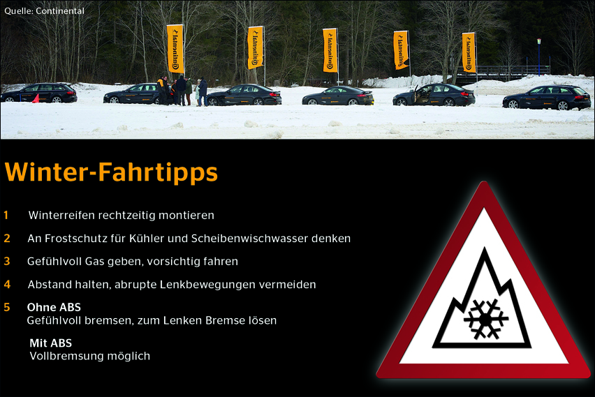 Neben den Eigenschaften, die solch ein Reifen aus seiner Entwicklung mitbringt, gibt es aber auch Umstände, die im Einflussbereich des Autofahrers liegen. Zwar schreibt der Gesetzgeber eine Mindest-Profiltiefe von 1,6 Millimetern vor, jedoch hat ein Reifen mit solch einem Restprofil nicht mehr ausreichend Grip für sicheres Handling und Bremsen. Entscheidende Meter kommt ein Fahrzeug mit mehr Profiltiefe schneller zum Stehen. Ab weniger als 4 Millimetern raten Reifenhersteller deswegen zum Austausch. Welche Sicherheitseinbußen man mit Sommerpneus auf verschneiten Straßen verzeichnet, zeigt ein Bremswegvergleich von einem Premium-Sommerreifen zu einem Premium-Winterreifen.