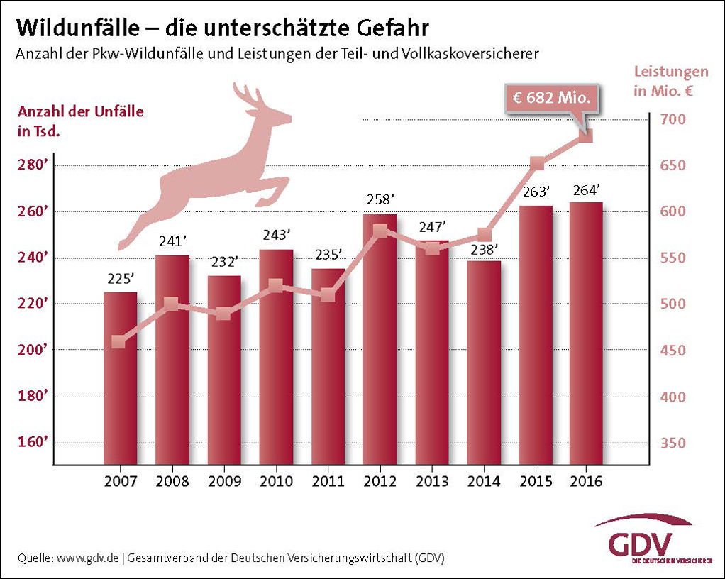 264.000 Wildunfälle gemeldet, wie aus der heute veröffentlichten Wildunfall- Statistik des Gesamtverbandes der Deutschen Versicherungswirtschaft (GDV) hervorgeht. Rechnerisch kommt es damit täglich zu mehr als 720 Kollisionen zwischen Pkw und Wildtieren. Die Versicherer zahlten für jeden Einzelfall im Schnitt 2.580 Euro, der wirtschaftliche Schaden durch Wildunfälle stieg von rund 653 Millionen auf fast 682 Millionen Euro.