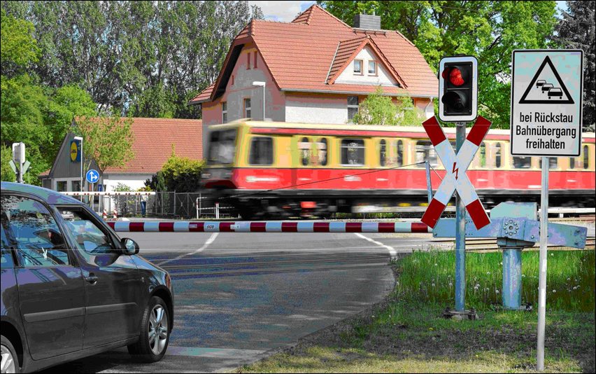 - Vorsicht an Übergängen von Bahn oder Straßenbahn. Das Andreaskreuz signalisiert: Schienenverkehr hat Vorrang. Ein rotes Blinklicht am Bahnübergang bedeutet ‚Halt!‘ Auch dann, wenn die Schranken noch nicht geschlossen sind.
