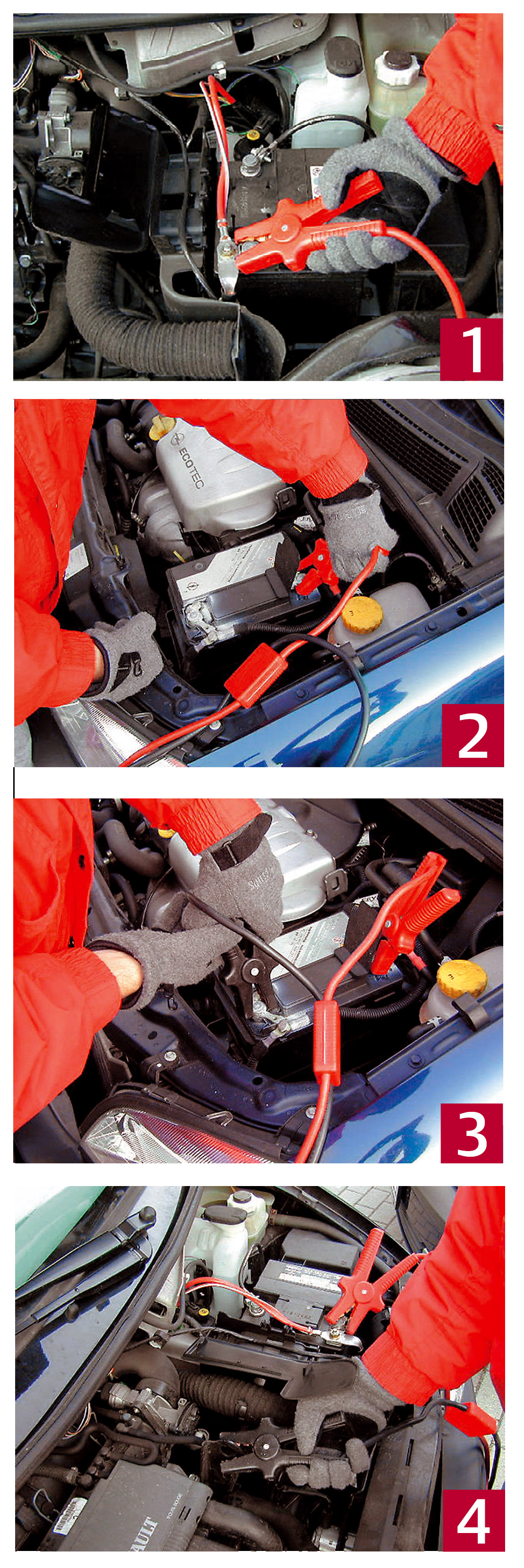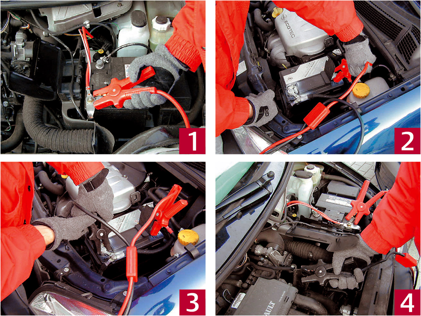 Sitzen beide Kabel fest an ihren Kontaktpunkten, ist der Motor des Spenderfahrzeugs zu starten. Bei einer tiefentladenen Batterie des Empfängerfahrzeugs (wenn bei zuvor eingeschalteter Zündung selbst die Armaturenlampen nicht mehr leuchten), sollte dieser mindestens zehn Minuten vor dem ersten Startversuch laufen. Während dieser Zeit kann die Batterie des Empfängerfahrzeugs genügend Strom ziehen. Danach folgt ein erster Startversuch des Pannenfahrzeugs. Springt der Motor nach drei bis vier Sekunden nicht an, kann man den Vorgang abbrechen und nach einer kurzen Pause wiederholen.