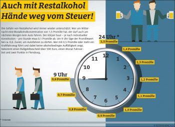 Die Gefahr von Restalkohol im Blut wird immer wieder unterschätzt. Gerade zur Karnevalszeit ist das Risiko hoch, sich mit einem zu hohen Promillewert unwissentlich morgens ans Steuer zu setzen. Wer beispielsweise bis Mitternacht Alkohol trinkt und eine Blutalkoholkonzentration von 1,5 Promille hat, darf auch am nächsten Morgen nicht Auto fahren. Der Körper baut – je nach individueller Konstitution – pro Stunde etwa 0,1 Promille ab. Um neun Uhr morgens läge der Promillewert rein rechnerisch noch bei etwa 0,6 Promille. Zu viel, um Auto fahren zu dürfen. Wer mit 0,5 Promille oder mehr ein Kraftfahrzeug führt und dabei keine alkoholbedingte Auffälligkeit zeigt, muss mit einen Bußgeldbescheid über 500 Euro, einem Monat Fahrverbot und zwei Punkten in Flensburg rechnen. Wer einen alkoholbedingten Fahrfehler begeht – zum Beispiel Schlangenlinien fährt – muss schon ab 0,3 Promille Blutalkohol mit einer Geld- oder Freiheitsstrafe, Punkten und Führerscheinentzug rechnen.