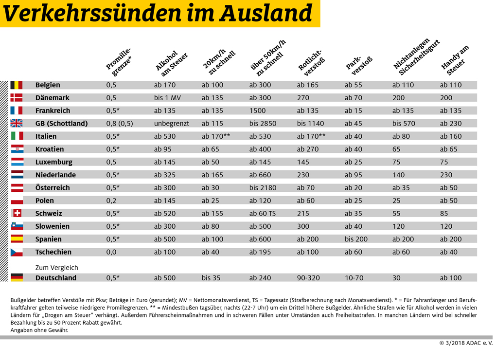 Ab einem Betrag von 70 Euro werden unbezahlte Strafen aus dem EU-Ausland hierzulande vollstreckt. Ausnahme ist Österreich: Hier beginnt die Grenze bereits bei 25 Euro. Für Verkehrsverstöße im Ausland gibt es keine Punkte in Flensburg. Ein von einer ausländischen Behörde ausgesprochenes Fahrverbot hat in Deutschland keine Auswirkung. Bei fehlerhaften Bußgeldbescheiden rät der ADAC, juristischen Beistand zu suchen und gegebenenfalls unverzüglich Einspruch einzulegen.