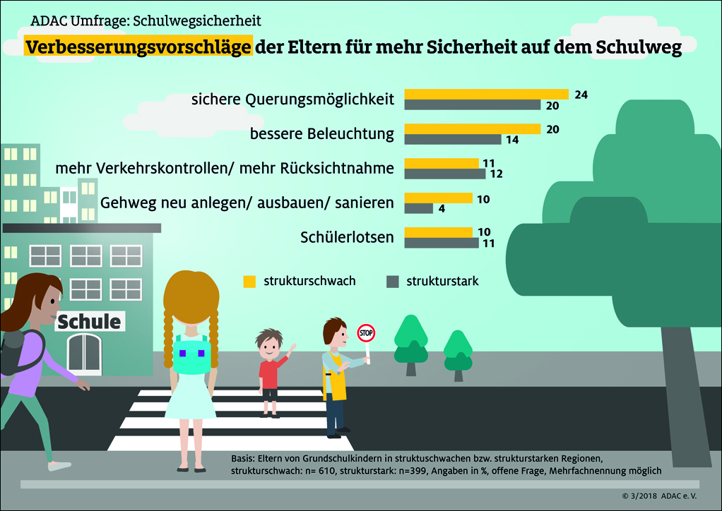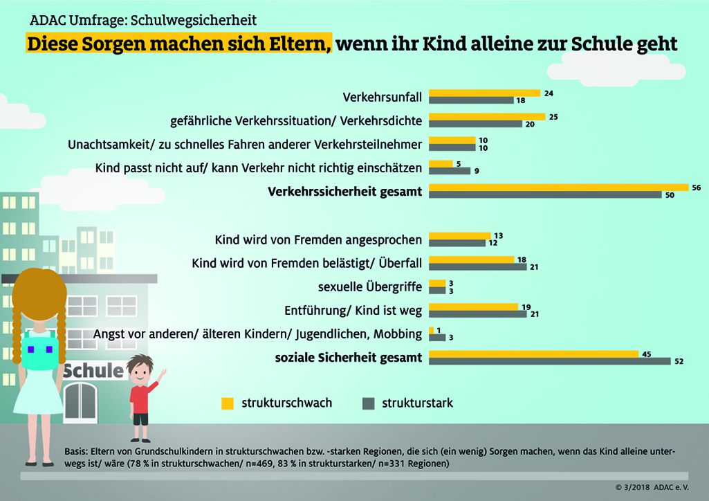 Rund 80 Prozent der Eltern haben Angst, wenn ihr Grundschulkind ohne Begleitung Erwachsener zur Schule geht. Das ist das Ergebnis einer bundesweiten Online-Umfrage des ADAC unter 1.009 Müttern oder Vätern. Während sich in strukturschwachen, oftmals ländlichen Gebieten die befragten Eltern vor allem um die Verkehrssicherheit ihrer Kinder sorgen, steht in strukturstarken, eher städtischen Regionen die soziale Sicherheit der Kinder etwas mehr im Vordergrund, also die Furcht vor Belästigungen oder Überfällen bis hin zu Entführungen.