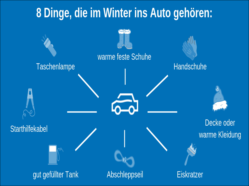 - Genügend Sprit, Decken und warme Kleidung als Vorsorge