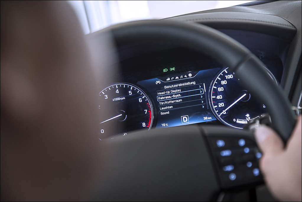 - Head-up-Display: Das Head-up-Display zeigt die wichtigsten Informationen, etwa die aktuelle Geschwindigkeit oder Navi-Meldungen, im Blickfeld des Fahrers entweder direkt auf der Frontscheibe oder auf eine kurz davor angebrachte kleine Scheibe. Der Fahrer muss so nicht mehr den Blick von der Straße nehmen.