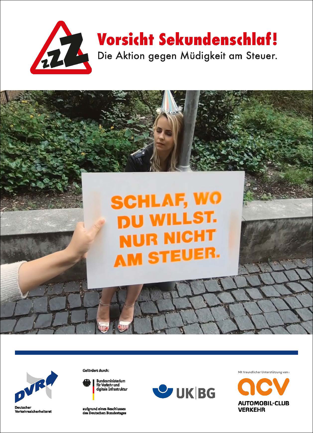 Um das Thema gerade zur Urlaubszeit ins Bewusstsein zu rücken, starten der ACV und der DVR gemeinsam eine neue Aktion im Rahmen ihrer Kampagne gegen Sekundenschlaf. Kern der Aktion sind sechs originelle Videos, die von Beginn der Sommerferien an auf den Seiten von ACV und DVR bei Facebook und Twitter zu sehen sind. Sie zeigen kuriose Situationen mit schlafenden Menschen, zum Beispiel im Café, im Waschsalon oder an einem Laternenpfahl. Die klare Botschaft der Videos: „Schlaf wo du willst. Nur nicht am Steuer.“