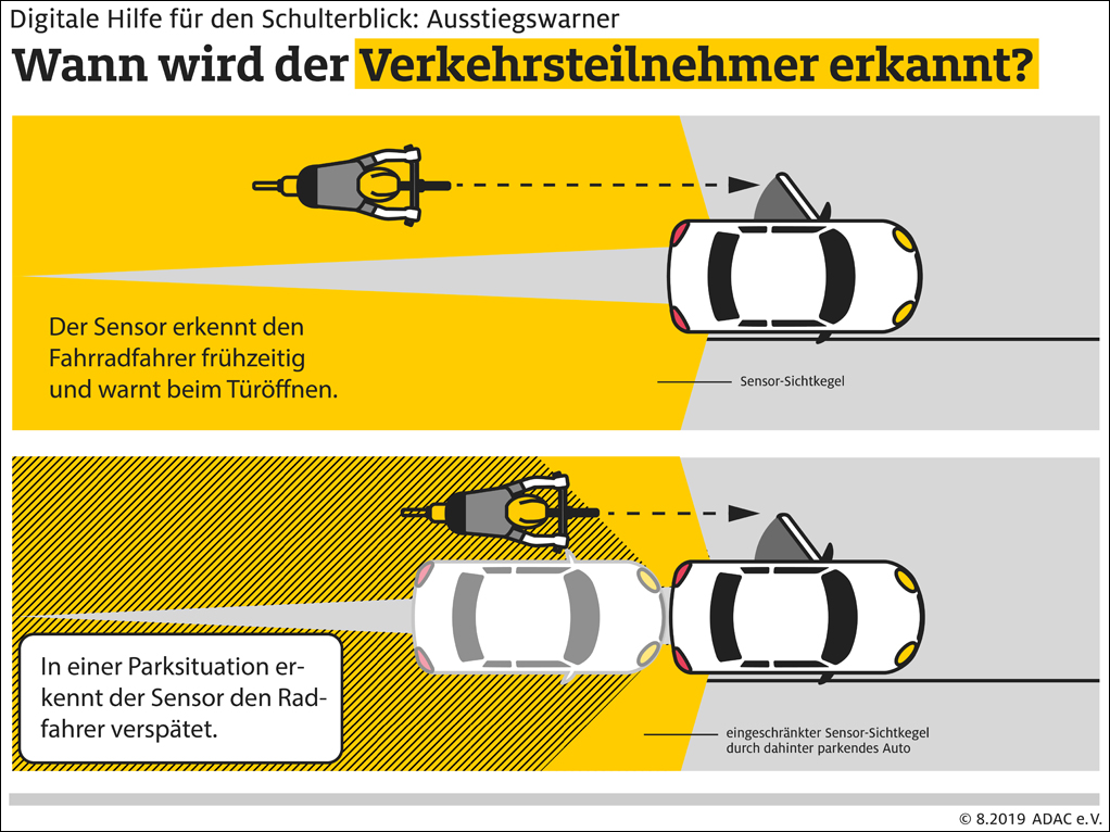 Auch wenn in der Parksituation mit verdecktem Sensor die Systeme nur eingeschränkt funktionieren, sind Ausstiegswarner aus Sicht des ADAC sinnvoll um Dooring-Unfälle zu vermeiden. In vielen Fahrzeugen ist die nötige Sensorik bereits mit einem Totwinkelassistenten verbaut und könnte vom Hersteller effizient genutzt werden. So können die Ausstiegswarner mit wenig Aufwand einen wichtigen Beitrag zur Verkehrssicherheit leisten – auch im Hinblick auf E-Scooter, die meist einen längeren Bremsweg haben als Fahrräder.