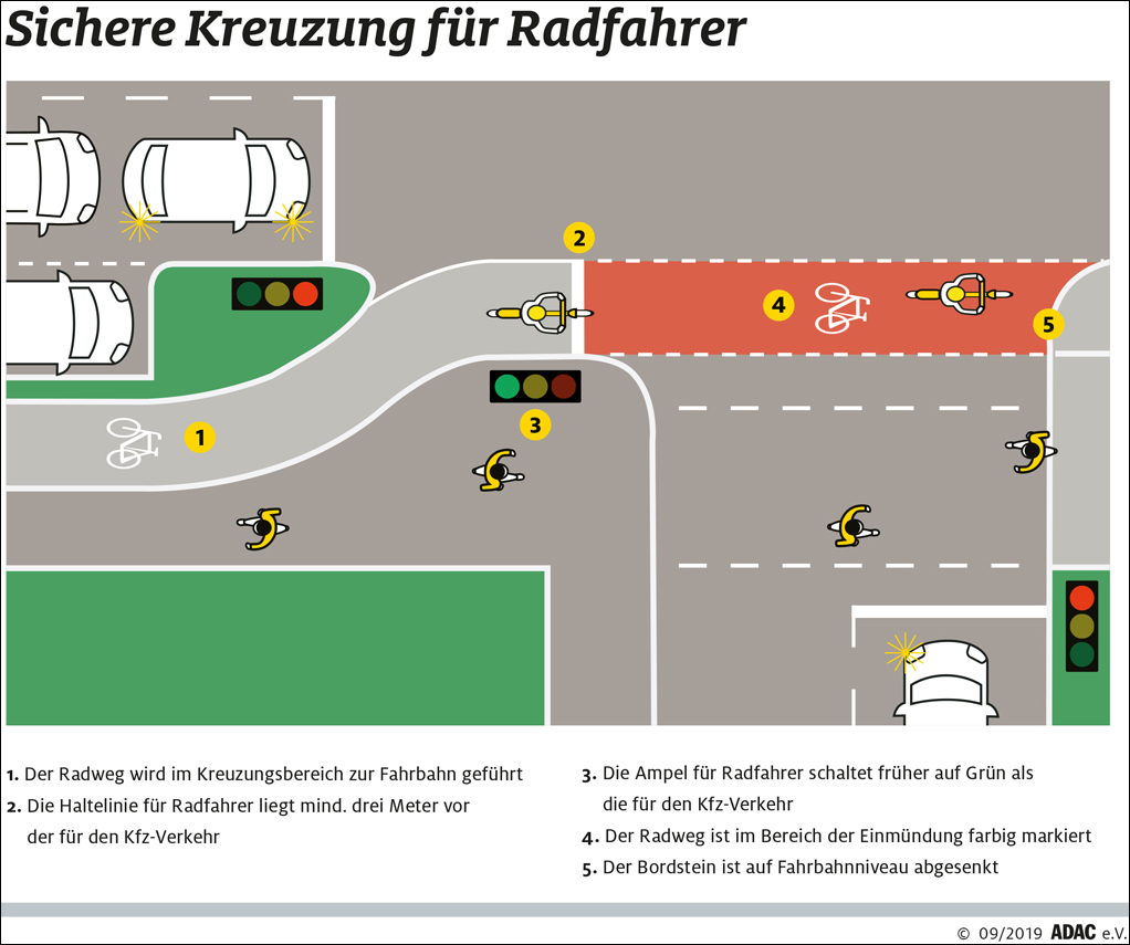 So sieht eine sichere Kreuzung für Radfahrer aus. Infografik: ADAC.Während das politische Berlin die Frage diskutiert, wie Konflikte zwischen Radverkehr und Auto entschärft werden können, hat der ADAC den Praxistest gemacht. Dabei wurden Kreuzungen und Grundstücksausfahrten in den Blick genommen, weil es dort am häufigsten zu Zusammenstößen von Fahrradfahrern und anderen Fahrzeugen kommt. Auf 120 Teststrecken in zehn deutschen Landeshauptstädten hat der ADAC untersucht, wie es um die Sicherheit von Radfahrern an Kreuzungen und Grundstücksausfahrten steht.