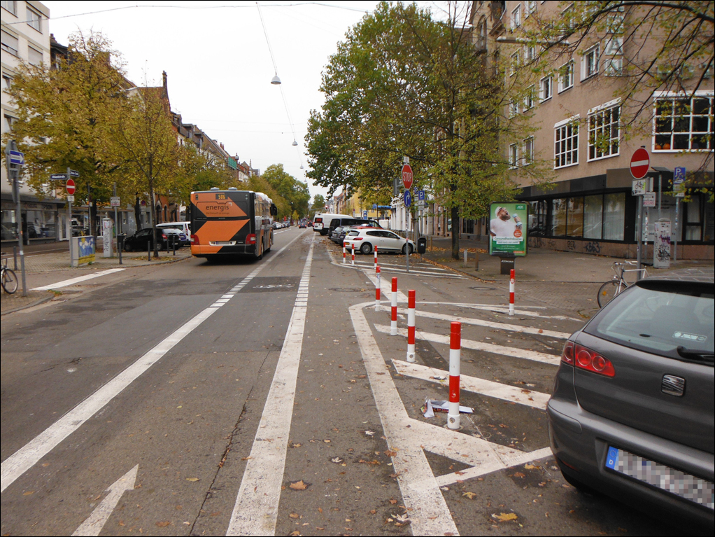 Positives Beispiel: Poller verhindern das Parken im Kreuzungsbereich. Das sorgt für freie Sicht. Foto: ADAC.Erhöhte Sicherheit bringen etwa auffällige Farbmarkierungen von Radwegen über Kreuzungen und Einmündungen. Poller im Kreuzungsbereich sorgen für freie Sicht, weil sie das Parken verhindern. Und wenn abgesetzte Radwege an Kreuzungen zur Fahrbahn geführt werden, können Autofahrer die Radler besser sehen. Auch hilfreich: große Aufstellflächen für Radfahrer an Ampeln vor der Haltelinie des restlichen Verkehrs sowie die Aufpflasterung von Radwegen bei Einmündungen, um die Vorfahrt der Radfahrer zu verdeutlichen.