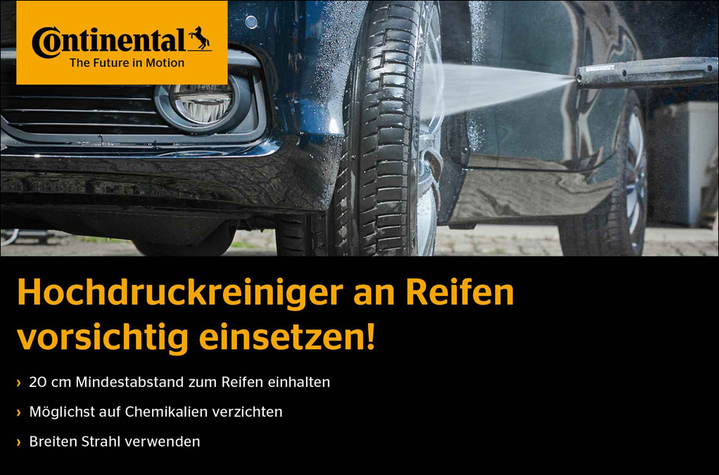 In der kalten Jahreszeit sind die Straßen oft schmutzig – nass, auch Spuren von geschmolzenem Schnee oder Auftaumitteln lassen Autofahrer Waschboxen ansteuern. Der Reifenhersteller Continental weist daher darauf hin, dass der Mindestabstand der Düse zum Reifen 20 cm betragen sollte und möglichst ohne Chemikalien sowie mit breiter Düse gewaschen werden sollte.