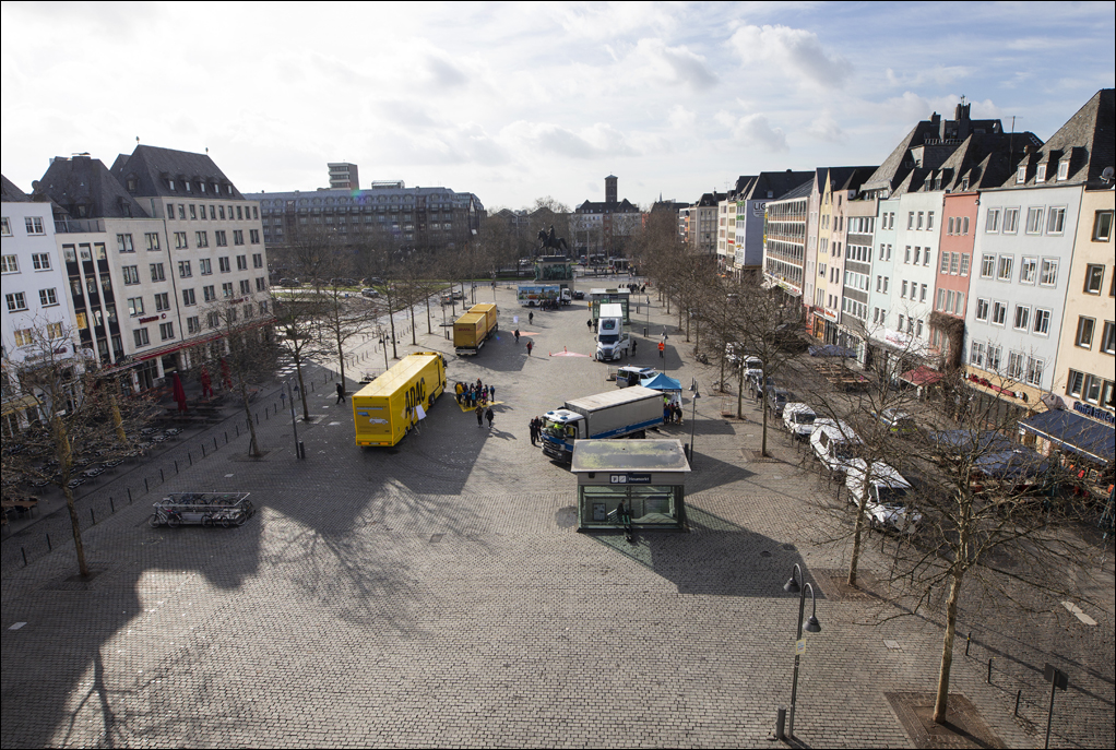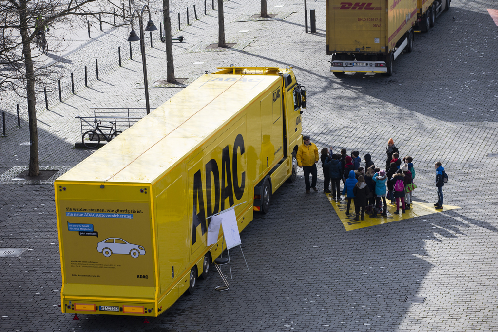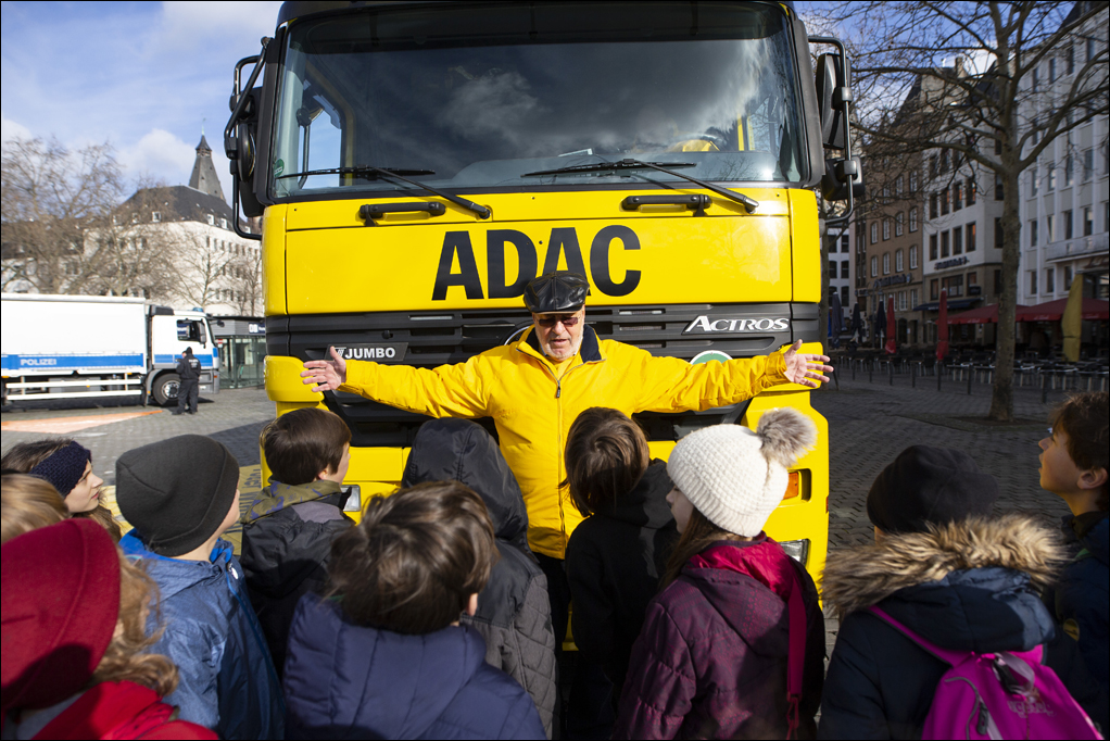 Start der Verkehrssicherheitsaktion „Toter Winkel“ von ADAC Nordrhein, Stadt Köln und Polizei Köln auf dem Heumarkt. Foto: Thomas Banneyer / ADAC.Der ADAC Nordrhein, die Stadt Köln und die Kölner Polizei sensibilisieren Grundschüler für brenzlige Situationen. Zugleich fordert der Mobilitätsclub: Abbiegeassistenten gehören als Serienausstattung in jeden Lkw und jeden Bus.