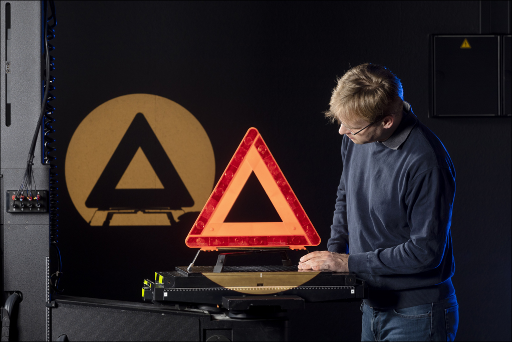 Auch die Standfestigkeit eines Warndreiecks checken die Experten im Windkanal. Neben alten standsicheren Ausführungsformen, die mehr als ein Kilogramm wiegen, sind heute konstruktiv gestaltete Warndreiecke erhältlich, die deutlich leichter sind. Leichte Warndreiecke ohne aerodynamische Anpassung werden bei Prüfungen im Windkanal als untauglich erkannt und das Kraftfahrt-Bundesamt als zuständige Behörde informiert.