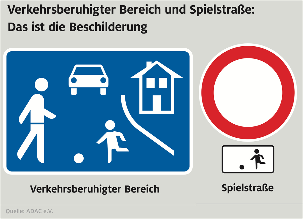 Das Schild, das die meisten Verkehrsteilnehmer mit einer Spielstraße in Verbindung bringen – Fußgänger und spielendes Kind, Auto und Haus auf blauem Grund (Zeichen 325.1) – kennzeichnet einen verkehrsberuhigten Bereich. Im Gegensatz zur Spielstraße dürfen hier zwar Autos und Zweiräder fahren, allerdings nur in Schrittgeschwindigkeit (nach der Rechtsprechung sind das vier bis maximal zehn km/h). Fußgänger dürfen die Straße in ihrer ganzen Breite nutzen, und Kinderspiele sind überall erlaubt. Allerdings dürfen sie den Fahrverkehr nicht unnötig behindern. Die anderen Verkehrsteilnehmer dürfen die Fußgänger weder gefährden noch behindern und müssen, wenn nötig, warten. Beim Ausfahren aus dem verkehrsberuhigten Bereich gelten die gleichen Regeln wie beim Verlassen eines Grundstücks. Eine Gefährdung anderer Verkehrsteilnehmer muss ausgeschlossen sein. Dazu gehören auch querende Fußgänger. Parken ist nur auf dafür vorgesehenen Flächen zulässig.