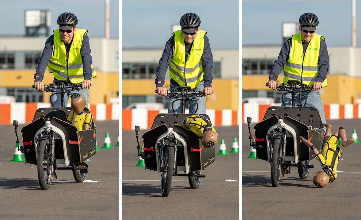 Der Ratschlag an die Fahrradhändler ist ebenso eindeutig: Beim Verkauf von Lastenfahrrädern muss mit dem Kunden unbedingt die geplante Nutzung besprochen werden. Falls der Transport von Kindern in Frage kommt, sollte der Händler in der Beratung eindringlich für die Anschaffung eines geeigneten Modells mit Anschnallsystem werben. „Die Bilder unseres Bremsversuchs liefern eindrückliche Argumente“, so Peter Rücker.