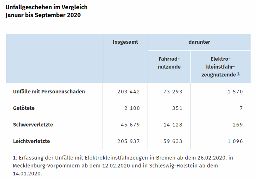 Die Zahlen erlauben einen Vergleich mit anderen Verkehrsmitteln, beispielsweise Fahrrädern: In den ersten neun Monaten des Jahres 2020 hat die Polizei deutschlandweit rund 73 293 Unfälle mit Personenschaden registriert, an denen Fahrradfahrer beteiligt waren. 351 Fahrradfahrer kamen dabei ums Leben, 14 128 wurden schwer verletzt, 59 633 leicht.