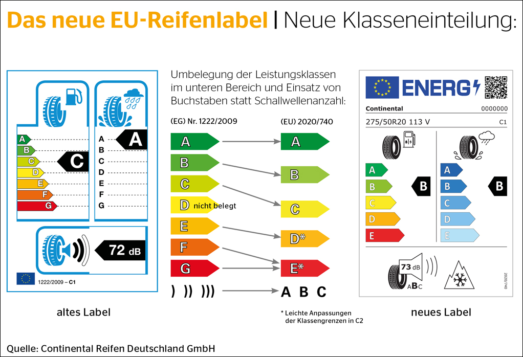 Beim neuen Label bleiben die Klassen A bis C unverändert. Bei C1- und C2-Reifen, also für Pkw und Leicht-Lkw, wird die bisher für Rollwiderstand und Nasshaftung nicht vergebene Klasse D nun mit den Werten aus der alten Klasse E gefüllt, die ihrerseits die Werte der alten Klassen F und G übernimmt. Damit wird das Label übersichtlicher und leichter zu interpretieren.