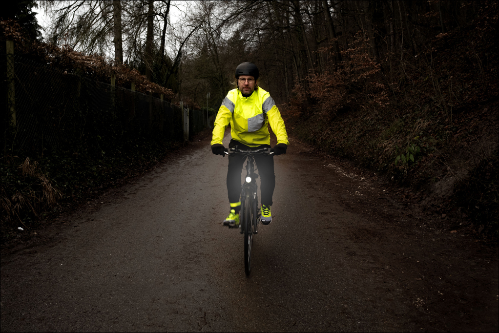 Ein wichtiger Sicherheitsfaktor beim Fahrradfahren ist auch auffällige, kontrastreiche Kleidung, versehen mit retroreflektierenden Elementen. Als so einfach wie wirkungsvoll hat sich erwiesen, für die Fahrt im Dunkeln eine retroreflektierende Warnweste aus dem Autozubehör überstreifen. Viele Fahrradjacken und auch Hosen werden mittlerweile in großer Auswahl mit großen Reflektorflächen, etwa in Neongelb oder Orange angeboten. Solche Kleidung fällt ebenso wie helle Schuhe im Scheinwerferlicht von Fahrzeugen schon von weitem auf. „Auffällige Kleidung und eine gute Beleuchtung sind im Dunkeln eine halbe Lebensversicherung für Radfahrer“, sagt Unfallforscher Ancona.