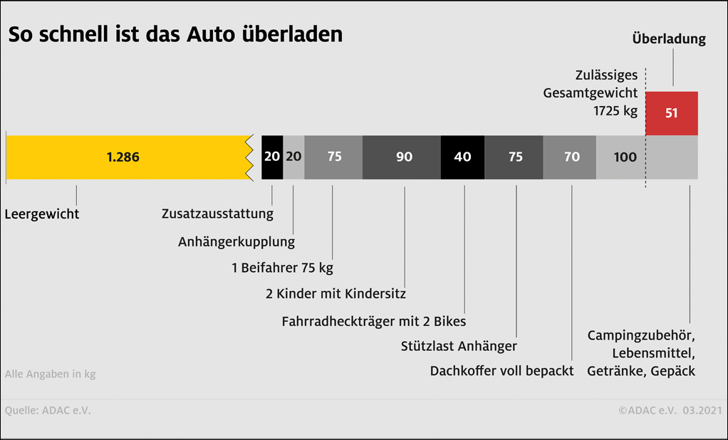Zu hohes Gewicht beeinträchtigt die Verkehrssicherheit, der Bremsweg verlängert sich und Ausweichmanöver verlaufen schleppender. Es drohen zudem Bußgelder bis 235 Euro und ein Punkt in Flensburg. Wie schwer das Auto sein darf, steht im Fahrzeugschein unter dem Buchstaben F. Von diesem Wert zieht man das Leergewicht des Fahrzeugs unter G ab. Die Differenz ergibt die Zuladung. Auch die zugelassene Achslast findet man im Fahrzeugschein, unter der Ziffer 8.1 (Vorderachse) und 8.2 (Hinterachse). „Ob das Auto zu voll beladen ist, können Urlauber überprüfen, indem sie das Fahrzeug wiegen lassen“, erklärt Lehmann. Das geht zum Beispiel in den Prüfzentren des ADAC, auf öffentlichen Pkw-Waagen, bei Wertstoffhöfen, Baustoffhandlungen, Sand- und Kieswerken oder Schrotthändlern.