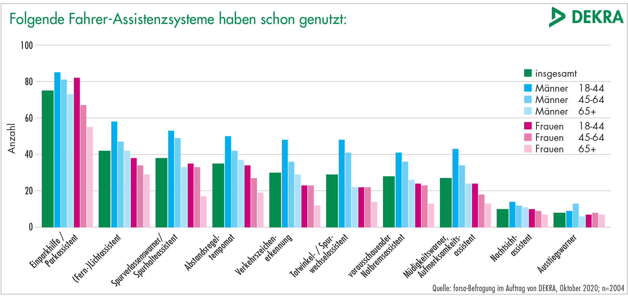 Große Unterschiede gibt es auch beim Alter, so etwa beim Totwinkel- beziehungsweise Spurwechselassistenten: In der Altersgruppe der 18- bis 24-jährigen Männer gaben 48 % an, ein solches System schon genutzt zu haben, bei den Männern ab 65 Jahren lediglich 22 %. Bei den befragten Frauen war der Unterschied nicht ganz so deutlich, allerdings hatten das System nur 22 % der Frauen der jungen Altersgruppe genutzt, bei den Seniorinnen waren es 14 %. Außerdem interessant: Die Einparkhilfe wird von 18- bis 24-jährigen Frauen und Männern mit 82 beziehungsweise 85 % häufiger genutzt als von den Befragten der anderen Altersklassen. Zum Vergleich: Von den befragten Seniorinnen nutzen gerade mal 55 % die Einparkhilfe.