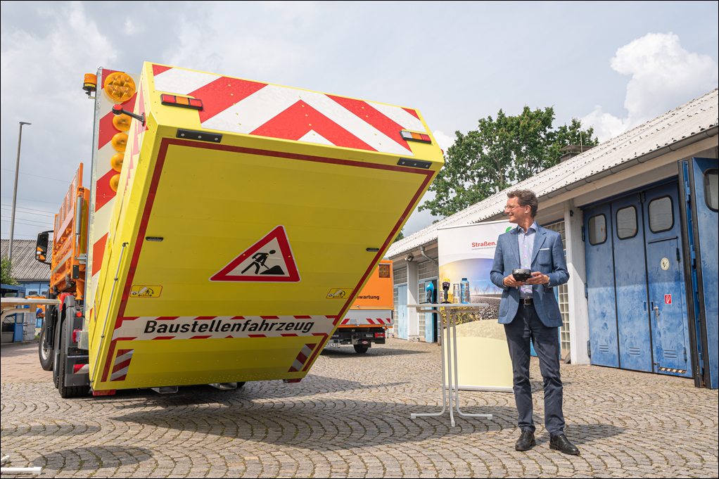 „Mobilität muss besser, sicherer und sauberer werden. Dazu gehört auch, den Arbeitsplatz Straße für unsere Straßenwärter, die jeden Tag für uns im gefährlichen Einsatz sind, so sicher wie möglich zu gestalten. Moderne Anprallschutzsysteme wie ‚Rambo II‘ können die Sicherheit im Straßenbau entscheidend voranbringen. Zugleich appellieren wir an alle Verkehrsteilnehmer, rücksichtsvoll und vorausschauend zu fahren“, erklärte Verkehrsminister Hendrik Wüst MdL. „Für den Piloten haben wir zwei Anpralldämpfer der Firma Nissen angeschafft, die zur Absicherung unserer Mitarbeitenden bei Arbeiten auf vielbefahrenen Bundesstraßen getestet werden sollen“, sagte Dr. Petra Beckefeld, Technische Direktorin des Landesbetriebs Straßen.NRW. „Das System ‚Rambo II‘ soll dabei laut Herstellerangaben für Aufprallgeschwindigkeiten von bis 100 Stundenkilometer bei auffahrenden Pkw Schutz bieten – für Geschwindigkeiten also, die auf Bundesstraßen auch gefahren werden.“ Dr. Sascha Kaiser: „Es ist unsere Pflicht als verantwortungsvoller Arbeitgeber, unsere Mitarbeiter an ihrem Arbeitsplatz bestmöglich zu schützen. Ganz klar gehen wir davon aus, dass Aufprallsysteme dazu beitragen, Leib und Leben unserer Beschäftigten noch besser zu schützen. Zudem wird uns das Pilotprojekt wichtige Erkenntnisse für den weiteren Arbeitsschutz im Straßenbau liefern.“