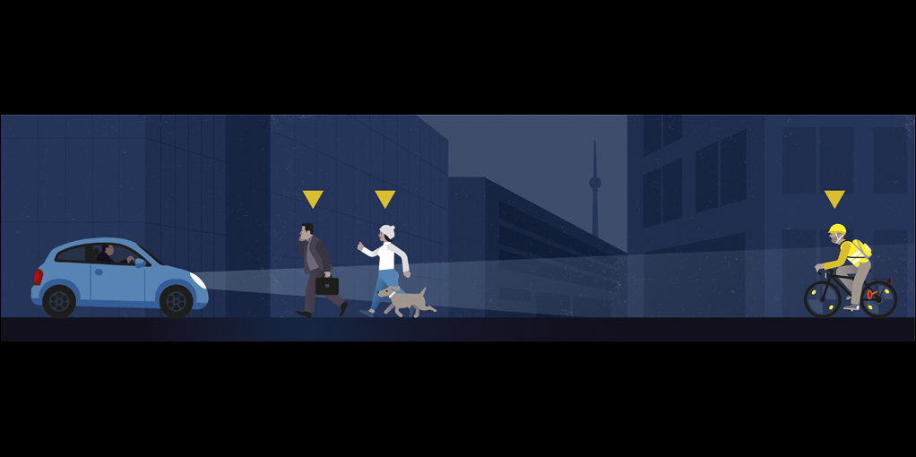 Am wichtigsten ist es, helle Kleidung zu tragen. Im Scheinwerferlicht eines Autos werden unbeleuchtete Fußgängerinnen und Fußgänger erst ab rund 25 Metern Abstand wahrgenommen. Die Strecke verlängert sich auf bis zu 40 Meter, wenn man sich hell statt dunkel kleidet. Zusätzlich sind reflektierende Kleidung, Reflektoren an Taschen oder für Radfahrerinnen und Radfahrer reflektierende Bänder an den Beinen sehr empfehlenswert.