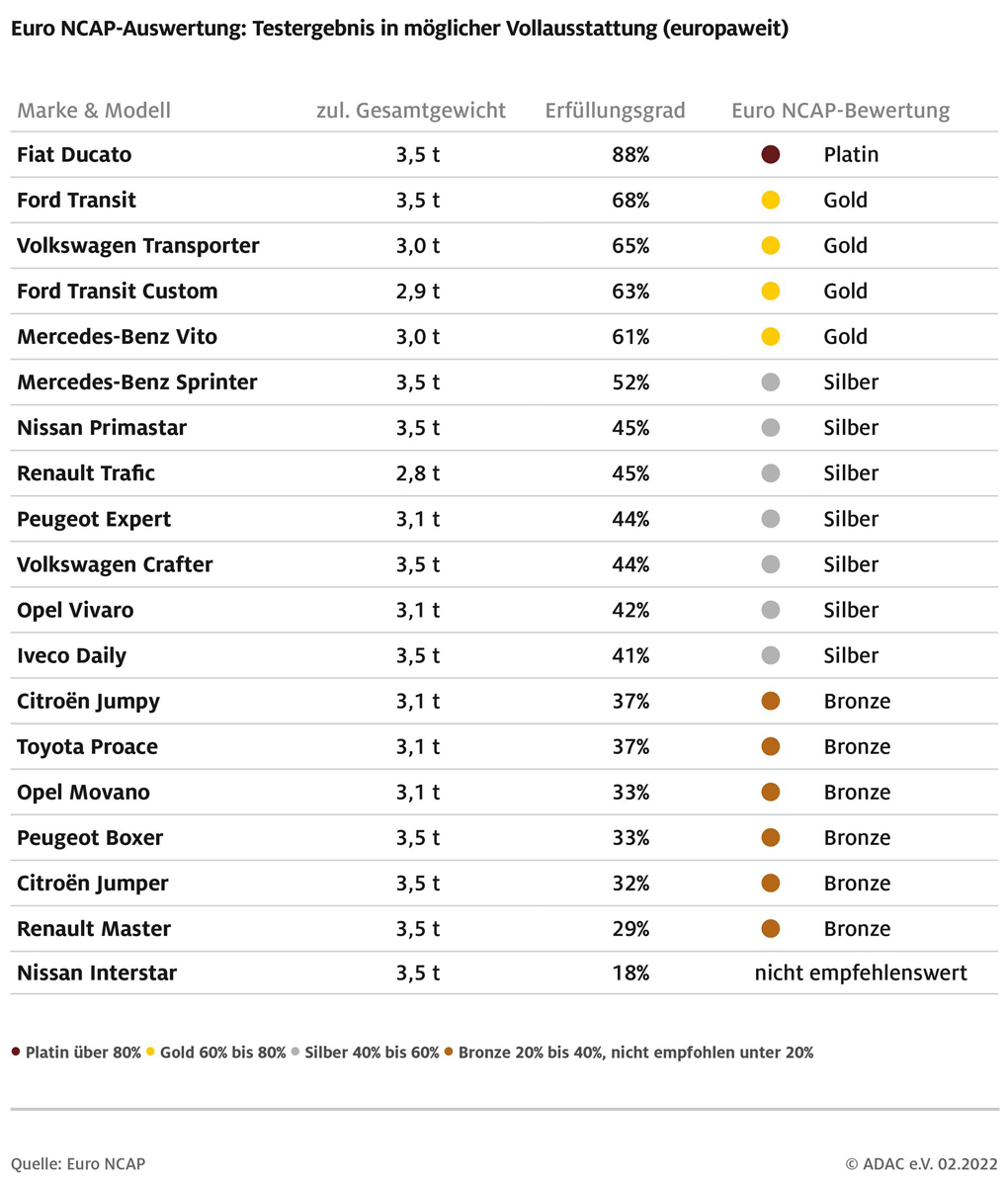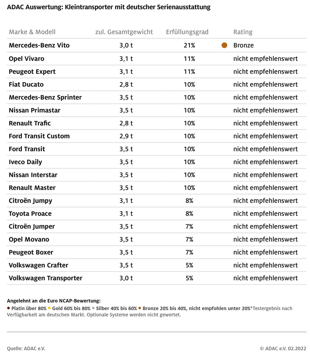 Euro NCAP hat die Transporter mit optionaler Vollausstattung untersucht, hier erreichen 18 Transporter eine Auszeichnung (Platin, Gold, Silber oder Bronze). Doch nach Einschätzung des ADAC werden bei dieser Fahrzeugklasse eher die Standardmodelle ohne aufpreispflichtige Extras gekauft. Daher hat sich der Club die 19 Modelle mit der in Deutschland erhältlichen Basisausstattung genauer angesehen. Und 18 der 19 getesteten Transporter bewertet der ADAC mit nicht empfehlenswert. Nur ein Modell, der Mercedes-Benz Vito kann Bronze erreichen.