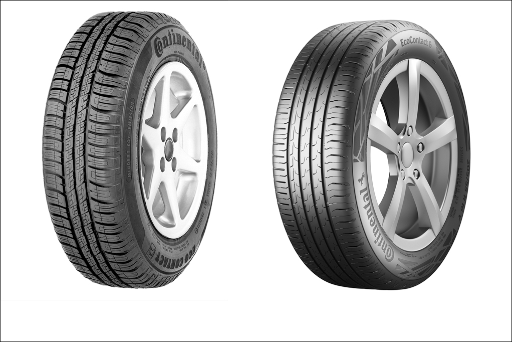 Conti EcoContact: die erste (l.) und die fünfte Generation (r.) im Vergleich. Foto: Continental Reifen.Der EcoContact 6 setzt Maßstäbe beim Rollwiderstand und der Laufleistung, die ihn immer wieder auf Spitzenpositionen bei den Reifentest der Fachmagazine bringen. Er vereint höchste Sicherheit mit Komfort, präziser Lenkansprache und guten Umwelteigenschaften auf hohem Niveau in einem Produkt. So konnten die Fahrleistungen beim Nassbremsen und beim Handling, im Rollwiderstand sowie der Laufleistung im Vergleich mit dem Vorgängermodell um bis zu 20 Prozent angehoben werden. Der Sommerreifen wird in 100 Größen von 13 bis 22 Zoll angeboten, mit Reifenbreiten zwischen 145 und 315 Millimetern und Querschnitten zwischen 80 und 30 Prozent. Der EcoContact 6 ist von einer Vielzahl von Fahrzeugherstellern für die Erstausrüstung freigegeben.