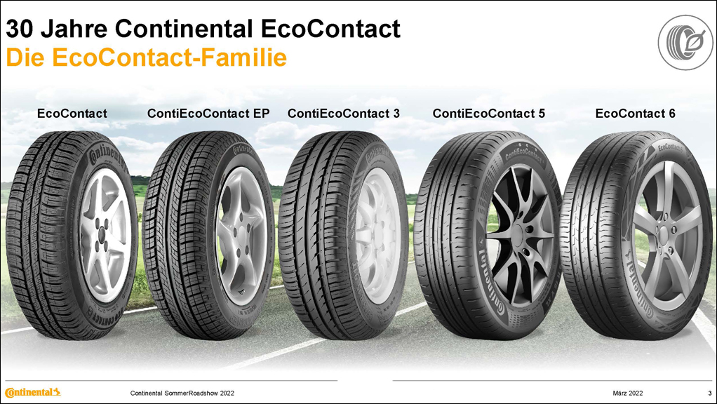 Fünf Generationen des Conti EcoContact. Infografik: Continental Reifen.Der Unternehmensbereich Reifen verfügt über 24 Produktions- und Entwicklungsstandorte weltweit. Continental ist einer der führenden Reifenhersteller und erzielte im Geschäftsjahr 2020 in diesem Unternehmensbereich mit mehr als 56.000 Mitarbeitern einen Umsatz in Höhe von 10,2 Milliarden Euro. Continental ist einer der Technologieführer im Bereich der Reifenproduktion und bietet eine breite Produktpalette für Personenkraftwagen, Nutz- und Spezialfahrzeuge sowie Zweiräder an. Durch kontinuierliche Investitionen in Forschung und Entwicklung leistet Continental einen wichtigen Beitrag zu sicherer, wirtschaftlicher und ökologisch effizienter Mobilität. Das Portfolio des Reifenbereichs umfasst dazu Dienstleistungen für den Reifenhandel und für Flottenanwendungen sowie digitale Managementsysteme für Reifen.