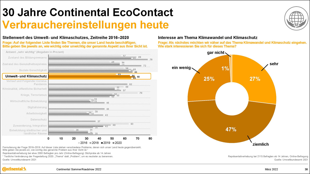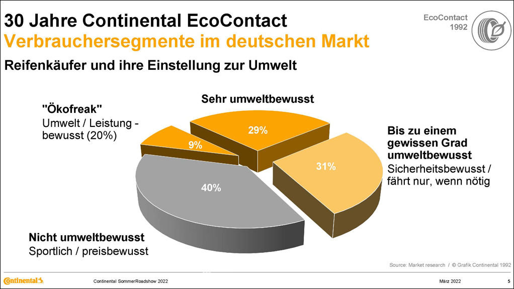 Umweltbewusstsein deutscher Reifenkäufer 1992. Infografik: Continental Reifen.Energiepreise sind hoch wie nie. Wer sparen will, kann da an vielen Schrauben drehen. Dazu zählt der Gebrauch des Autos und seine Ausstattung: Auch die Wahl der Reifen bieten ein gewisses Spritspar-Potenzial. Reifenhersteller sind schon seit längerem mit Reifen auf dem Markt, die besonders für ein ökonomisches Autofahren ausgelegt sind. Zu den Pionieren zählt hier der deutsche Reifenhersteller Continental, die vor 30 Jahren den EcoContact auf den Markt brachten. Umweltbewusstsein der Deutschen 2022. Infografik: Continental Reifen.Conti-Marktforscher hatten damals Reifenkäufer befragt – und rund 60 Prozent hatten angegeben, an Umweltthemen interessiert zu sein und ihre individuelle Mobilität entsprechend umzustellen. Bei einer Umfrage des Umweltbundesamtes 2020 gaben 99 Prozent der Befragten an, an Umweltthemen interessiert zu sein, was nahe legt, dass dieser Anteil auch bei den Reifenkäufern (also der Auto-affinen Bevölkerung) deutlich über dem von 1992 liegen dürfte. Dass die Verantwortlichen bei Continental in der Verantwortung stünden, auch in Bezug auf Umweltbelange vorauszudenken, hatte Helmut Gieselmann, damaliger Generalbevollmächtigter der Continental AG, bei der Vorstellung des ersten EcoContact betont.