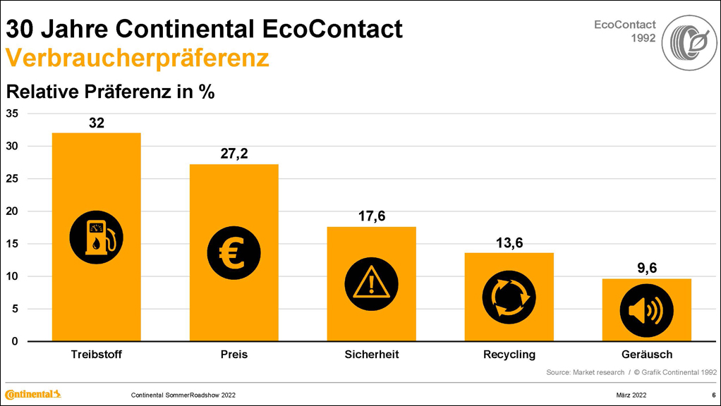 Verbraucherpräferenzen 1992. Infografik: Continental Reifen.Vor 30 Jahren brachte der deutsche Reifenhersteller Continental seinen ersten „Spritspar-Reifen“ auf den Markt: den Conti EcoContact. Über die Jahre und Generationen des Reifens – der EcoContact 6 ist die fünfte Generation – haben die Entwickler neben Verbesserungen an Rollwiderstand und Laufleistung nie aus den Augen verloren, auch das Sicherheitspotenzial weiter zu erhöhen: „Das ist bei uns nicht verhandelbar“, erklärte Klaus Engelhart, Pressesprecher Pkw-Reifen der Continental Reifen Deutschland GmbH. Ein Anspruch, den der EcoContact in den letzten 30 Jahren mit seiner Weiterentwicklung mehr als erfüllte.