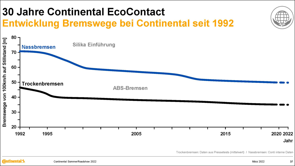 Conti EcoContact: Verbesserungen der Bremswege. Infografik: Continental Reifen.In den vergangenen 30 Jahren sank von Generation zu Generation der Rollwiderstand und damit der Reifenabrieb, was Kraftstoffeffizienz und Laufleistung steigerte. Verbessert haben die Entwickler dabei Bodenhaftung, Seitenstabilität, Bremswege und das Nasshandling sowie das Abrollgeräusch. Ausgehend von Reifen für die Kompakt- und Mittelklasse sowie „Zweitwagen“ im Ersatzgeschäft in den ersten Generationen reicht die Produktpalette des EcoContact 6 bis in die Oberklasse und in die Erstausrüstung von Fahrzeugen in der Produktion.