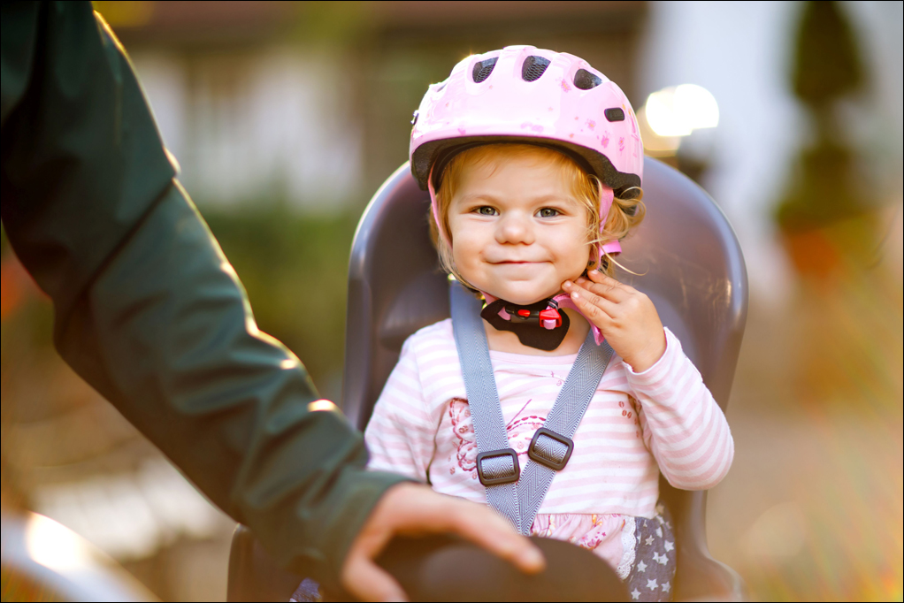 Die Straßenverkehrsordnung (StVO) schreibt vor, dass nur Personen, die mindestens 16 Jahre alt sind, Kinder bis zu einem maximalen Alter von sieben Jahren mit dem Fahrrad befördern dürfen. Ein Mindestalter, ab dem ein Kind mit dem Fahrrad mitgenommen werden darf, schreibt der Gesetzgeber hingegen nicht vor. Vorgegeben ist auch, dass für Kinder besondere Sitze vorhanden sein müssen. Dabei darf nicht die Gefahr bestehen, dass das Kind mit seinen Füßen in die Radspeichen gerät. Als Prävention können Eltern hierfür beispielsweise eine entsprechende Schutzverkleidung anbringen. Speziell für Fahrradanhänger gilt: Ist dieser für die Beförderung von Kindern ausgestattet, dürfen maximal zwei Kinder bis zum vollendeten siebten Lebensjahr mitfahren. Bei der Beförderung eines Kindes mit Behinderung gilt die Altersbegrenzung nicht.[1] Eine gesetzliche Vorschrift zum Tragen eines Fahrradhelms gibt es in Deutschland nicht, auch nicht für Kinder. Doch unabhängig davon, wie das Kind mit dem Rad befördert wird, ist ein Helm ein unbedingtes Muss – für Kinder und Eltern. Denn ein passender und gut sitzender Fahrradhelm kann bei einem Sturz schwere Kopfverletzungen verhindern.