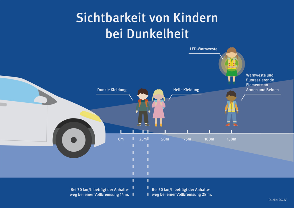 „Eltern sollten darauf achten, dass ihre Kinder leuchtende und retroreflektierende Kleidung und Taschen tragen“, sagt Corina Walther, Sachgebietsleiterin persönliche Schutzausrüstung gegen physikalische Einwirkungen am Institut für Arbeitsschutz bei der Deutschen Gesetzlichen Unfallversicherung (IFA). Grelle statt gedeckter Farben erzeugen einen Kontrast zum Hintergrund, sodass entsprechend gekleidete Kinder schneller und besser gesehen werden.