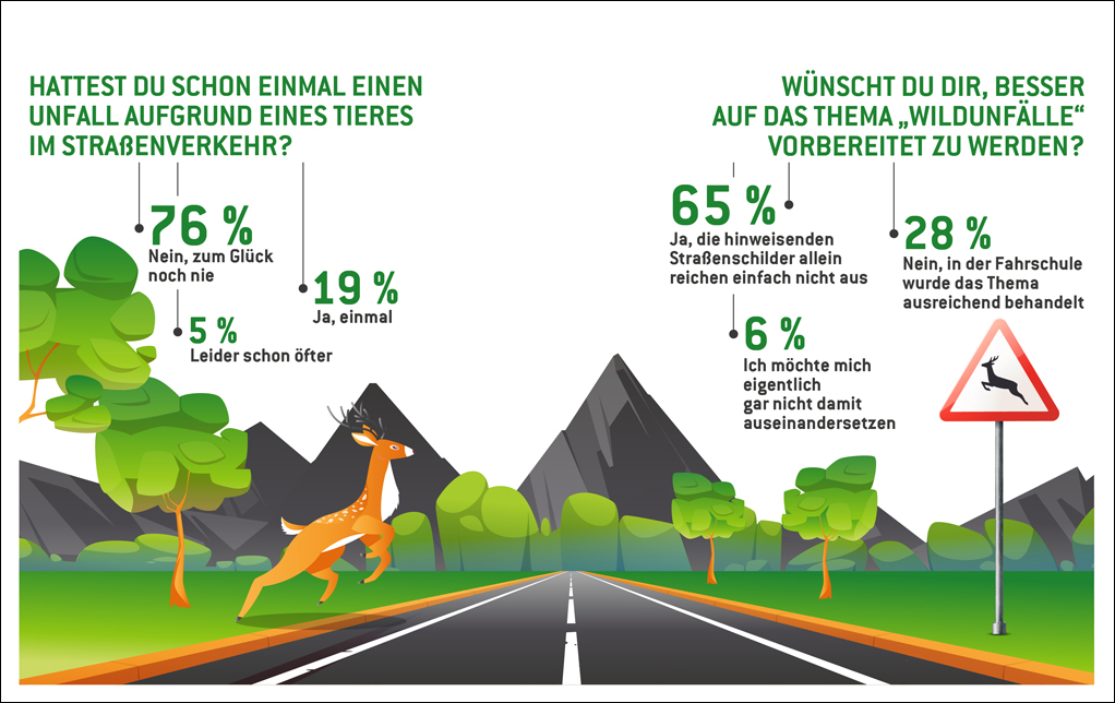 Immer wieder kommt es vor, dass sich doch ein Kleintier, wie beispielsweise ein Eichhörnchen, auf die Straße verirrt, vor ein fahrendes Auto läuft und durch eine Vollbremsung einen Auffahrunfall verursacht. Doch wer haftet in diesem Fall? 39 Prozent der Befragten sähen die Schuld bei dem bremsenden Autofahrer. „Tatsächlich ist dieser Sachverhalt nicht ganz eindeutig und muss jeweils individuell verhandelt werden, da die Größe des Tieres, die Art der Straße und das Fahrverhalten beider Beteiligten berücksichtigt werden müsste“, erläutert Jan Meyer-Hamme. „Experten jedoch raten dazu, das Lenkrad festzuhalten und dem Ausweichreflex zu wiederstehen.“ Dennoch gab über die Hälfte der Studien-Teilnehmenden an, dass sie wahrscheinlich trotzdem aus Reflex ruckartig in die Eisen steigen würden, wenn ihnen ein Tier vor das Auto läuft. „Insbesondere bei großen Tieren steigt natürlich auch die Gefahr, dass sich die Insassen im Falle eines ungebremsten Zusammenstoßes verletzen,“ erläutert der Förster abschließend. „Deshalb ist es ratsam, besonders in der Morgen- und Abenddämmerung, bei Nacht sowie bei Nebel genügend Abstand zum vorausfahrenden Auto zu halten und die Geschwindigkeit zu reduzieren, um auf mögliche Wildwechsel-Situationen schnell reagieren zu können.“