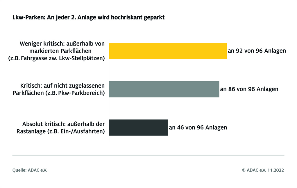 Infografik: ADAC.Die Parksituation wurde von den Testern an den Anlagen zu drei verschiedenen Uhrzeiten erfasst: um 22 Uhr, 23 Uhr und 0 Uhr. Dabei waren die Anlagen in der Regel bereits um 22 Uhr komplett voll. Unterschieden wurde zwischen drei verschiedenen Parkverstößen jeweils nach dem Gefährlichkeitsgrad: Lkw, die außerhalb markierter Parkflächen abgestellt waren, beispielsweise in der Fahrgasse zwischen den Lkw-Parkflächen (an 92 von 96 Anlagen). Lkw, die auf nicht für sie freigegebenen Flächen oder im Haltverbot parkten, beispielsweise im Pkw-Bereich (86 von 96 Anlagen) und Lkw, die außerhalb der Rastanlage, in den Ein- und Ausfahrtspuren oder auf dem Seitenstreifen abgestellt wurden. Das war an 46 von 96 Anlagen der Fall.