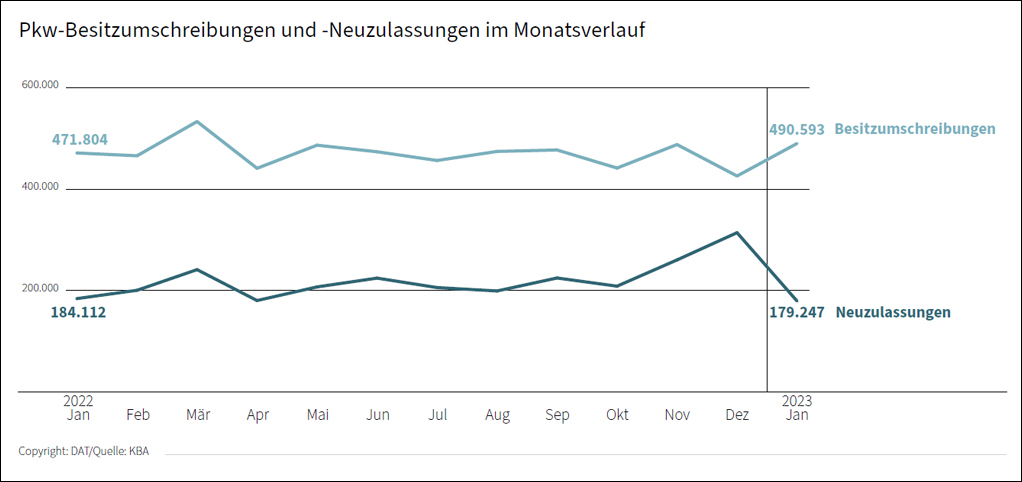 Der Start ins Autojahr 2023 war verhalten. Auf dem Gebrauchtwagenmarkt zeigte sich nach dem desaströsen Vorjahr ein kleiner Hoffnungsschimmer: Mit 490.593 Besitzumschreibungen lag der Januar 4 Prozent über dem Vorjahresmonat und 15 Prozent über dem schwachen Dezember 2022. Auf dem Neuwagenmarkt wurden im Januar nur 179.247 Neuzulassungen registriert. Das waren 3 Prozent weniger als im Vorjahresmonat und 43 Prozent weniger als im Vormonat Dezember. Ende 2022 sorgten vor allem die Änderungen bei der Umweltprämie für einen Run auf die E-Autos. Damit ging der Dezember 2022 als stärkster Neuzulassungsmonat in die Geschichte der Neuzulassungsstatistik des Kraftfahrt-Bundesamtes (KBA) ein.