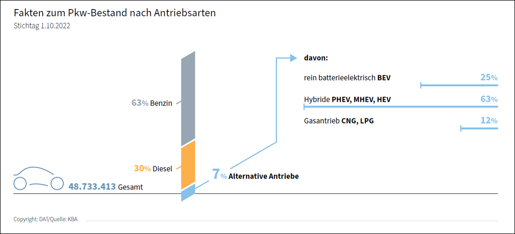 Die Neuzulassungen speisen von jeher den Pkw-Bestand. Doch bis die Entwicklungen auf dem Neuwagenmarkt im Bestand Wirkung zeigen, ist aufgrund der Bestandsgröße von fast 49 Mio. Pkw Geduld gefragt. So registrierte das KBA zum Stichtag 1.10.2022 gerade einmal 2 Prozent Pkw mit reinem Elektromotor. Der Großteil wird immer noch von Benzinern (63 Prozent) und Dieseln (30 Prozent) bestimmt.