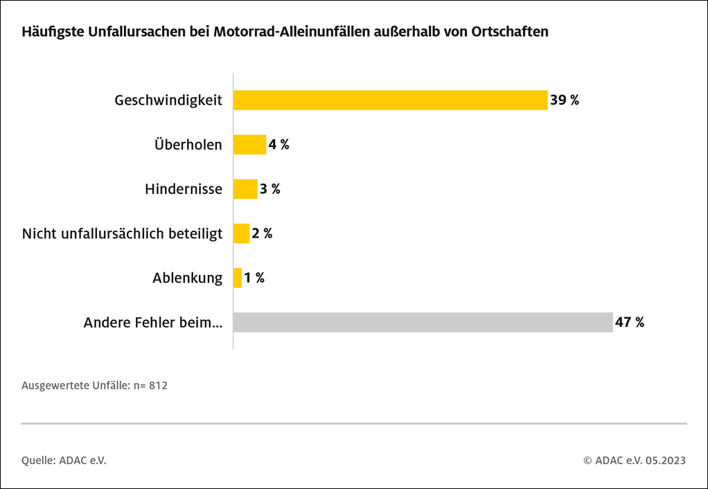 Bei rund einem Drittel handelt es sich um Alleinunfälle, bei denen die Biker meist auf kurvigen Streckenabschnitten die Kontrolle über ihr Fahrzeug verlieren, stürzen und von der Straße abkommen. Bei knapp zwei Dritteln der Unfälle kollidieren die Motorradfahrer mit anderen Verkehrsteilnehmern. Bei mehr als der Hälfte davon handelt es sich um Abbiege- und Kreuzungsunfälle. Zu 80 Prozent kollidieren Motorradfahrer mit Pkw.