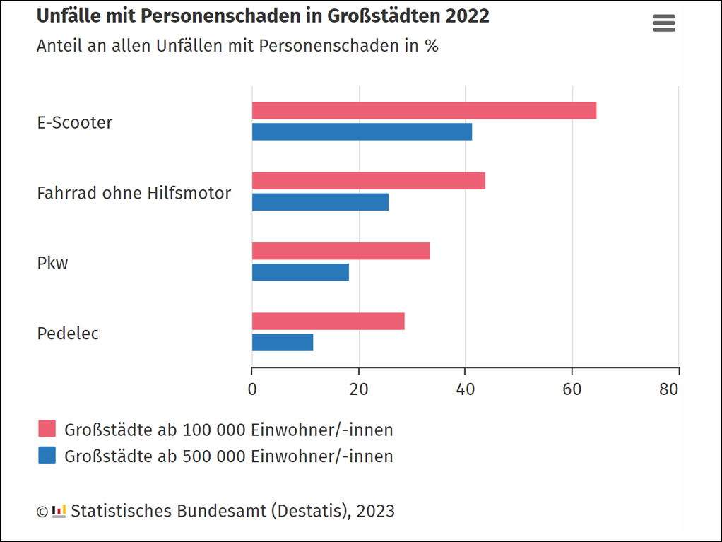 E-Scooter. Foto: Ernest Ojeh / unsplash.Mit der Zahl der genutzten e-Scooter (oder e-Roller) steigt die Anzahl der Unfälle, in die diese Fahrzeuge verwickelt sind. Nach Angaben des Statistischen Bundesamt (Destatis) kam es 2022 zu 8.260 (gemeldeten) Unfällen mit e-Scootern, bei denen Menschen verletzt wurden, 1.234 davon schwer. Das waren 49 Prozent mehr als im Jahr zuvor (5.535 Unfälle), wobei es wohl eine große Dunkelziffer geben dürfte. Elf Menschen starben (2021: fünf Todesopfer). Anteil der e-Scooter-Unfälle an allen Unfällen mit Personenschaden. Infografik: Destatis.Die meisten der Verunglückten waren eher jünger (über 40 Prozent unter 25 Jahre), häufig hatten sie Alkohol getrunken oder waren falsch auf Straßen und Gehwegen gefahren. Hier kam es auch häufiger zu Kollisionen mit Fußgängern. E-Scooter sind keine Spielzeuge, sondern erreichen ein Tempo von bis zu 20 km/h und stellen damit eine Gefahr für andere dar. Die Gefahren gingen weniger von e-Scootern in Privatbesitz aus, sagen die Unfallforscher des GDV (Gesamtverband der Deutschen Versicherungswirtschaft), sondern überwiegend von den überall im Fußgängerraum abgestellten Fahrzeugen der Leihanbieter (Sharing), die jeder mit einer Smartphone-App nutzen kann – ohne Nachweis von persönlicher Eignung oder fundierten Kenntnis der Regeln. Und dass arglose oder in ihrer Sicht eingeschränkte Fußgänger über mitunter achtlos liegen gelassene Fahrzeuge stolpern, ist in den offiziellen Unfallzahlen noch gar nicht berücksichtigt.