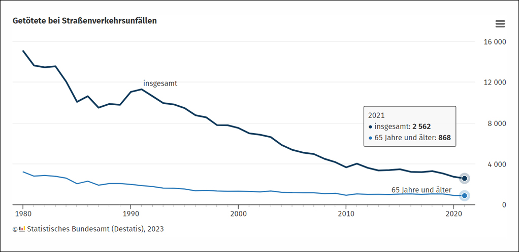 Im Jahr 2021 verunglückten insgesamt 45.123 Menschen im Alter von 65 oder mehr Jahren im Straßenverkehr, 868 von ihnen wurden getötet, weitere 11.169 schwer verletzt. Insgesamt betrug der Anteil der Senioren an allen Verunglückten 13,9 Prozent, bei den Todesopfern war er mit 33,9 Prozent wesentlich höher. Ältere Menschen erleiden im Durchschnitt schwerere Unfallfolgen als jüngere. So wurden 24,8 Prozent der verunglückten älteren Menschen schwer verletzt, der entsprechende Anteil bei den unter 65-Jährigen war mit 15,7 Prozent deutlich geringer. Darüber hinaus ist für mindestens 65-Jährige die Wahrscheinlichkeit geringer, einen Verkehrsunfall zu überleben. Während der Anteil der Getöteten an den Verunglückten bei den unter 65-Jährigen bei 0,6 Prozent liegt, beträgt er bei den Seniorinnen und Senioren 1,9 Prozent. Hier spiegelt sich zum einen die mit zunehmendem Alter nachlassende physische Widerstandskraft wider. Zum anderen nehmen ältere Menschen häufiger als ungeschützte Fußgänger am Verkehr teil und sind daher einem größeren Risiko für schwerwiegendere Verletzungen ausgesetzt.
