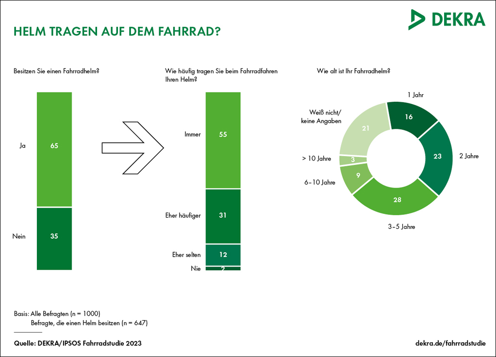 Unter den Helmbesitzern sagen 55 Prozent, dass Fahrradfahren ohne Kopfschutz für sie nicht in Frage kommt. 31 Prozent der Besitzer nutzen den Helm eher häufig, 12 Prozent eher selten und 2 Prozent nie.